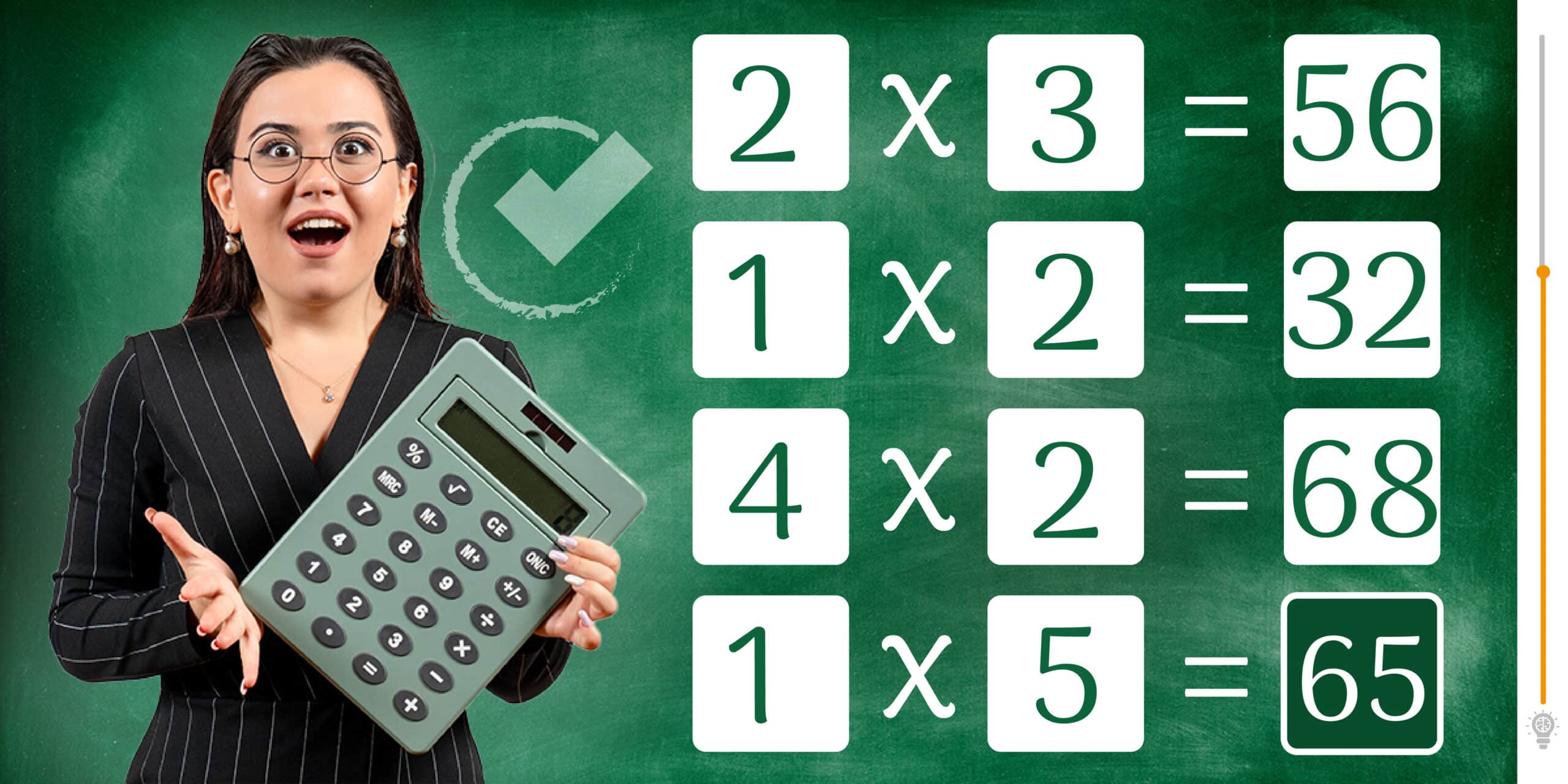 Good thinking will help you find that 2×3=6 and 2 +3=5 to give 2×3=56. Similarly, 1×2=2 and 1 +2=3 give 1×2=32. For 4×2=68, the calculation gives 4×2=8 and 4 +2=6, i.e. 4×2=68. So for 1×5, you’ll get 65 because 1×5=5 and 1 +5=6.