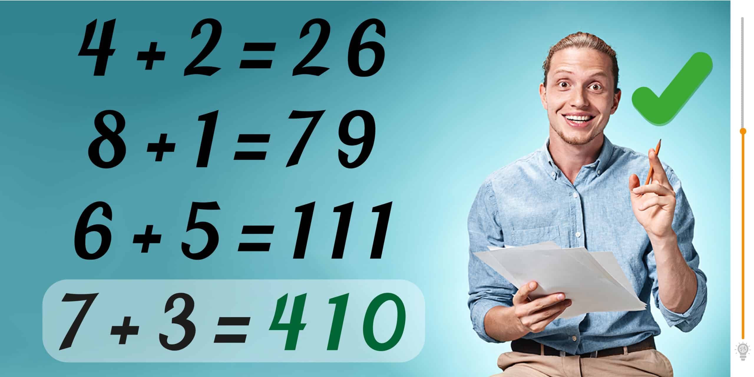 • Math riddle: Solve this equation! If 4 +2=26, 8 +1=79, 6 +5=111, 7 +3 = ?